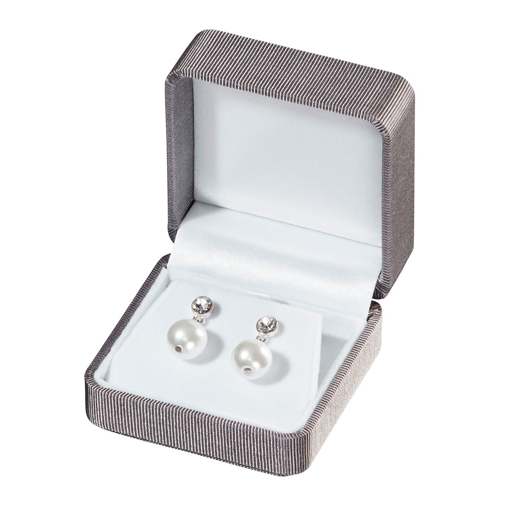 Estuche forrado en satén rayado para Pendientes Solapa. Interior aterciopelado. Disponible en Negro, Burdeos y Gris.