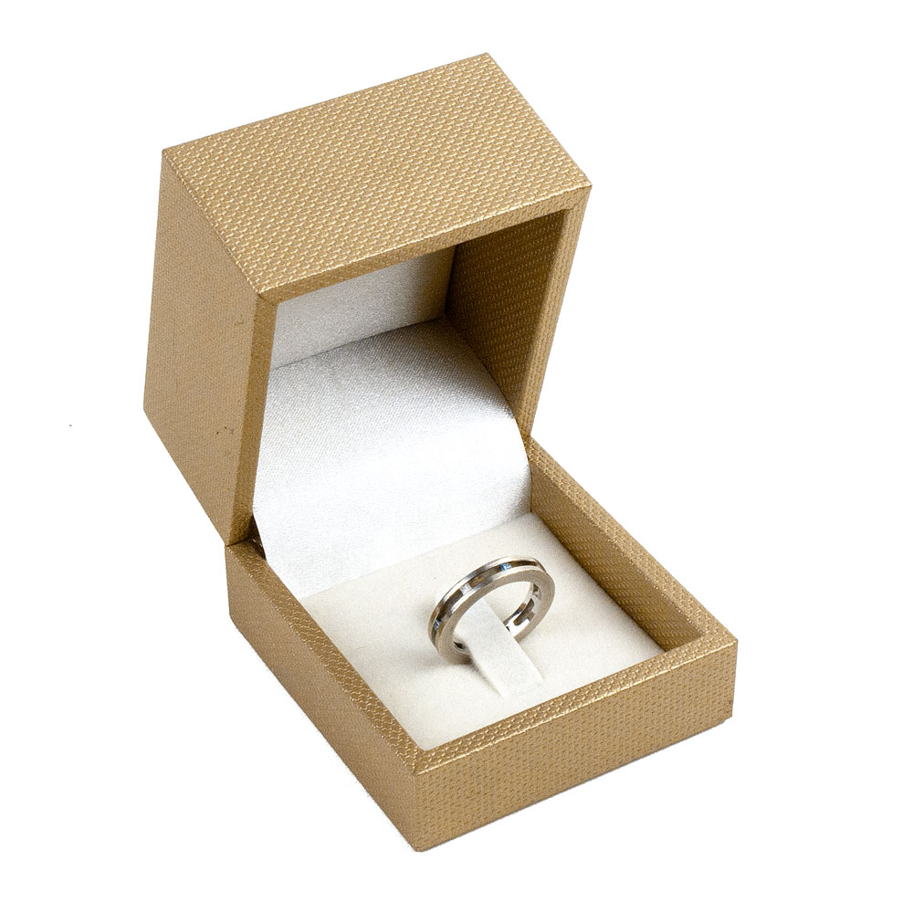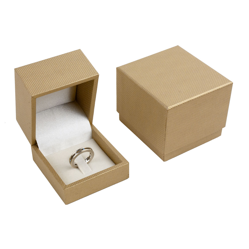 Estuche forrado para Sortija Lengüeta con atractivo papel gofrado e interior aterciopelado. Incluye caja exterior forrada. Disponible en Champagne gofrado (interior aterciopelado crema).