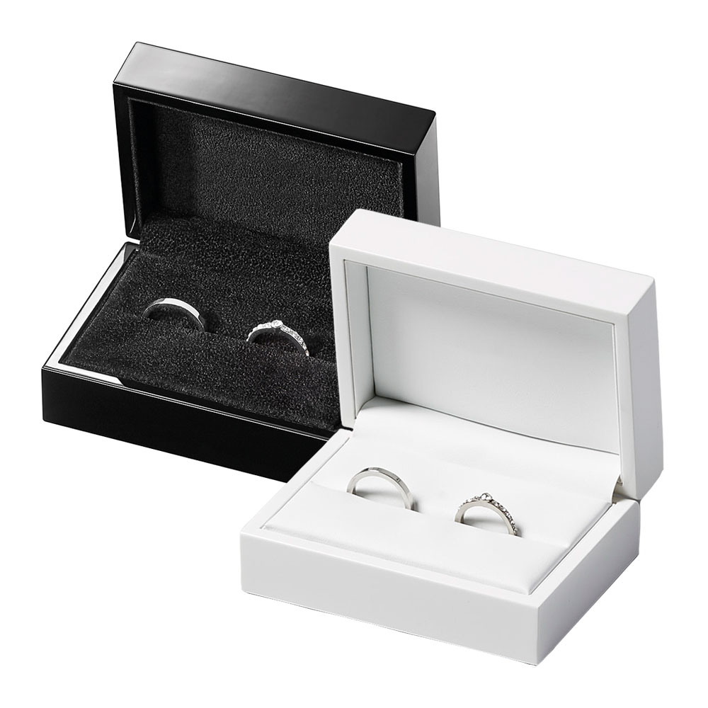 Estuche de madera lacada brillo para Alianzas Saja. Disponible en Blanco (interior símil piel blanco) y Negro (interior antelina negro).