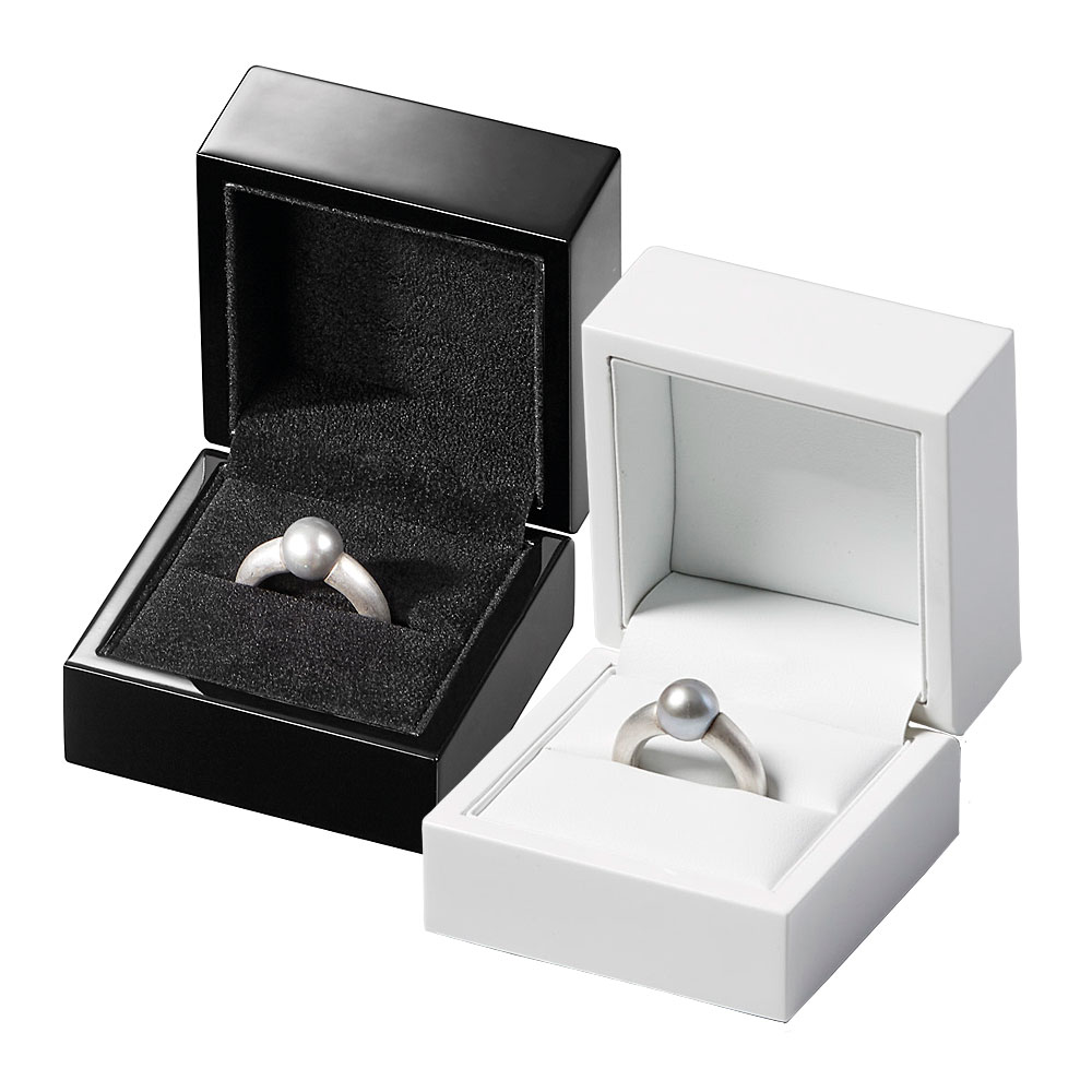 Estuche de madera lacada brillo para Sortija Saja. Disponible en Blanco (interior símil piel blanco) y Negro (interior antelina negro).